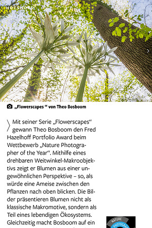 Mit seiner Serie „ Flowerscapes“ gewann Theo Bosboom den Fred Hazelhoff Portfolio Award beim Wettbewerb „ Nature Photographer of the Year“. Mithilfe eines drehbaren Weitwinkel-Makroobjektivs zeigt er Blumen aus einer ungewöhnlichen Perspektive – so, als würde eine Ameise zwischen den Pflanzen nach oben blicken. Die Bilder präsentieren Blumen nicht als klassische Makromotive, sondern als Teil eines lebendigen Ökosystems. Gleichzeitig macht Bosboom auf ein alarmierendes Problem aufmerksam: Während seiner Arbeit begegnete er deutlich weniger Insekten als erwartet – ein Zeichen für den dramatischen Rückgang der Biodiversität in vielen Teilen Europas.