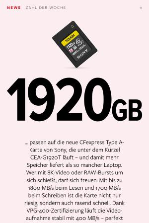 ... passen auf die neue CFexpress Type A- Karte von Sony, die unter dem Kürzel CEA-G1920T läuft – und damit mehr Speicher liefert als so mancher Laptop. Wer mit 8K-Video oder RAW-Bursts um sich schießt, darf sich freuen: Mit bis zu 1800 MB / s beim Lesen und 1700 MB / s beim Schreiben ist die Karte nicht nur riesig, sondern auch rasend schnell. Dank VPG-400-Zertifizierung läuft die Videoaufnahme stabil mit 400 MB / s – perfekt für lange Drehs ohne Frame-Drops. Ein Kraftpaket im Taschenformat – das allerdings mit 1.200 Euro auch den Preis so manches Kamerabodys knackt. Aber hey, viele Gigabyte auf wenig Raum haben eben ihren Preis.