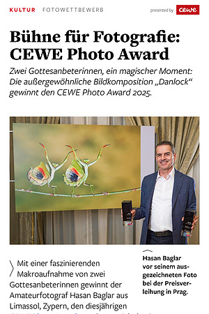 Zwei Gottesanbeterinnen, ein magischer Moment: Die außergewöhnliche Bildkomposition „ Danlock“ gewinnt den CEWE Photo Award 2025.