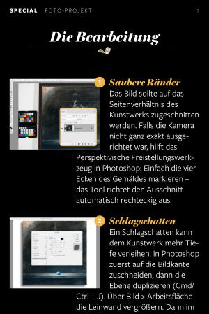 Ein Schlagschatten kann dem Kunstwerk mehr Tiefe verleihen. In Photoshop zuerst auf die Bildkante zuschneiden, dann die Ebene duplizieren( Cmd / Ctrl + J). Über Bild > Arbeitsfläche die Leinwand vergrößern. Dann im Ebenenbedienfeld auf das FX-Symbol klicken, Schlagschatten auswählen und mit den Einstellungen spielen. Den Winkel des Schattens kannst du per Ziehen anpassen.