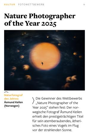 naturephotographer oftheyear. com wegische Fotograf Åsmund Keilen erhielt den prestigeträchtigen Titel für sein atemberaubendes, ätherisches Foto eines Vogels im Flug vor der strahlenden Sonne.