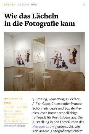 Ob wir lächeln, wenn wir wissen, dass wir fotografiert werden, oder nicht, ob wir dabei Zähne zeigen oder nicht, das hängt von gesellschaftlichen Konventionen und der Entwicklung der Fototechnik ab. Dass die Menschen, die im 19. Jahrhundert ins Fotoatelier gingen, um sich fotografieren zu lassen, selten lächeln, entsprach den Wünschen und Konventionen, wie man sich auf einem Porträt zeigen wollte. Schon 1927 schrieb der Soziologe Siegfried Kracauer davon, dass sich die Welt – und damit auch der Mensch darin – ein „ Photographiergesicht“ zugelegt habe. Die Präsentation im Museum Ludwig will zeigen, dass sich daran bis heute nichts verändert hat. Das Lächeln hat eine Geschichte. Und wir sollten es uns erhalten.