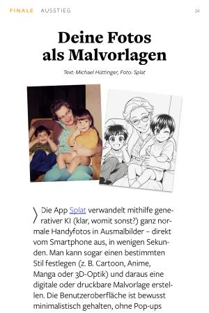Die App Splat verwandelt mithilfe generativer KI( klar, womit sonst?) ganz normale Handyfotos in Ausmalbilder – direkt vom Smartphone aus, in wenigen Sekunden. Man kann sogar einen bestimmten Stil festlegen( z. B. Cartoon, Anime, Manga oder 3D-Optik) und daraus eine digitale oder druckbare Malvorlage erstellen. Die Benutzeroberfläche ist bewusst minimalistisch gehalten, ohne Pop-ups oder Ablenkung – so können auch Kinder sie weitgehend selbstständig nutzen. Um versehentliche Käufe zu vermeiden, sind Abo-Funktionen und Einstellungen durch eine Altersabfrage geschützt.