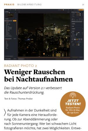 Radiant Photo für Win & Mac, ab 139 Euro für jede Kamera eine Herausforderung. Ob zur Abenddämmerung oder nach Sonnenuntergang: Wer bei schwachem Licht fotografieren möchte, hat zwei Möglichkeiten. Entweder hat man die Abend- bzw. Nachtaufnahmen vorab sorgfältig geplant, hat ein stabiles Dreibeinstativ dabei und kann somit bei niedriger ISO-Empfindlichkeit länger belichten. Oder es handelt sich um eine spontane Aufnahmesituation, in der kein Stativ vorhanden ist. In dem Fall muss die ISO-Empfindlichkeit so weit erhöht werden, bis die Verschlusszeiten kurz genug sind, um scharfe Aufnahmen aus der freien Hand zu machen.