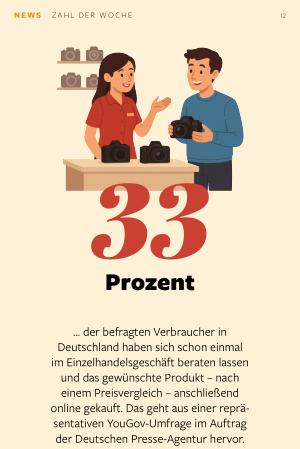 ... der befragten Verbraucher in Deutschland haben sich schon einmal im Einzelhandelsgeschäft beraten lassen und das gewünschte Produkt – nach einem Preisvergleich – anschließend online gekauft. Das geht aus einer repräsentativen YouGov-Umfrage im Auftrag der Deutschen Presse-Agentur hervor. Im Handel wird dieses Verhalten auch „ Beratungsklau“ genannt. Auch bei erklärungsbedürftigen Produkten wie hochwertigen Kameras dürfte diese Erschleichung von Beratungsleistung ohne Umsatz beim Händler einen hohen Anteil einnehmen. Immerhin: Fast die Hälfte der Befragten lehnt ein solches Verhalten ab. In der PhotoWeekly- Redaktion sind es übrigens 100 Prozent.