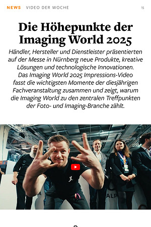 Händler, Hersteller und Dienstleister präsentierten auf der Messe in Nürnberg neue Produkte, kreative Lösungen und technologische Innovationen. Das Imaging World 2025 Impressions-Video fasst die wichtigsten Momente der diesjährigen Fachveranstaltung zusammen und zeigt, warum die Imaging World zu den zentralen Treffpunkten der Foto- und Imaging-Branche zählt.