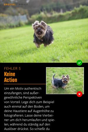 Um ein Motiv authentisch einzufangen, sind außergewöhnliche Perspektiven von Vorteil. Lege dich zum Beispiel auch einmal auf den Boden, um deine Haustiere auf Augenhöhe zu fotografieren. Lasse deine Vierbeiner um dich herumlaufen und spielen, während du ständig auf den Auslöser drückst. So schießt du Fotos aus einem interessanteren Blickwinkel, den wir in unserem Alltag gewöhnlich nicht kennen.