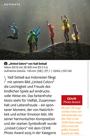 Yadi Setiadi aus Indonesien fängt mit seinem Bild „ United Colors“ die Leichtigkeit und Freude des kindlichen Spiels auf eindrucksvolle Weise ein. Das farbenfrohe Motiv steht für Vielfalt, Zusammenhalt und Lebensfreude – ein spontaner Moment, der von Natürlichkeit und echter Emotion lebt. Mit seiner harmonischen Komposition und der starken Symbolkraft wurde „ United Colors“ mit dem CEWE Photo Award 2025 in der Kategorie