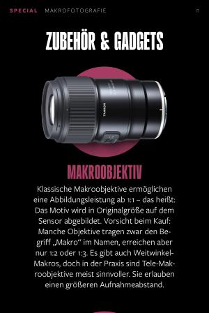 MAKROOBJEKTIV Klassische Makroobjektive ermöglichen eine Abbildungsleistung ab 1:1 – das heißt: Das Motiv wird in Originalgröße auf dem Sensor abgebildet. Vorsicht beim Kauf: Manche Objektive tragen zwar den Begriff „ Makro“ im Namen, erreichen aber nur 1:2 oder 1:3. Es gibt auch Weitwinkel- Makros, doch in der Praxis sind Tele-Makroobjektive meist sinnvoller. Sie erlauben einen größeren Aufnahmeabstand.