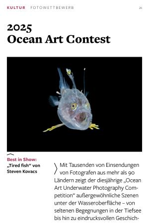 Mit Tausenden von Einsendungen von Fotografen aus mehr als 90 Ländern zeigt der diesjährige „ Ocean Art Underwater Photography Competition“ außergewöhnliche Szenen unter der Wasseroberfläche – von seltenen Begegnungen in der Tiefsee bis hin zu eindrucksvollen Geschichten zum Thema Naturschutz.