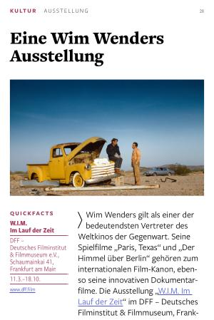 Wim Wenders gilt als einer der bedeutendsten Vertreter des Weltkinos der Gegenwart. Seine Spielfilme „ Paris, Texas“ und „ Der Himmel über Berlin“ gehören zum internationalen Film-Kanon, ebenso seine innovativen Dokumentarfilme. Die Ausstellung „ W. I. M. Im Lauf der Zeit“ im DFF – Deutsches Filminstitut & Filmmuseum, Frankfurt am Main, widmet sich seinem