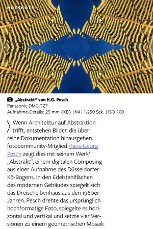 Wenn Architektur auf Abstraktion trifft, entstehen Bilder, die über reine Dokumentation hinausgehen. fotocommunity-Mitglied Hans-Georg Pesch zeigt dies mit seinem Werk‘ „ Abstrakt“, einem digitalen Composing aus einer Aufnahme des Düsseldorfer Kö-Bogens. In den Edelstahlflächen des modernen Gebäudes spiegelt sich das Dreischeibenhaus aus den 1960er- Jahren. Pesch drehte das ursprünglich hochformatige Foto, spiegelte es horizontal und vertikal und setzte vier Versionen zu einem geometrischen Mosaik zusammen. So wird die klare Architekturlinie zu einem rhythmischen Spiel aus Licht, Struktur und Symmetrie.