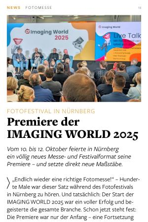 „ Endlich wieder eine richtige Fotomesse!“ – Hunderte Male war dieser Satz während des Fotofestivals in Nürnberg zu hören. Und tatsächlich: Der Start der IMAGING WORLD 2025 war ein voller Erfolg und begeisterte die gesamte Branche. Schon jetzt steht fest: Die Premiere war nur der Anfang – eine Fortsetzung folgt im kommenden Jahr.