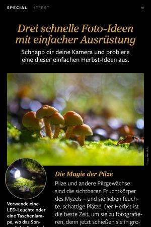 des Myzels – und sie lieben feuchte, schattige Plätze. Der Herbst ist die beste Zeit, um sie zu fotografieren, denn jetzt schießen sie in großer Zahl aus dem Boden. Für diese Motive ist ein Makroobjektiv ideal. Alternativ funktionieren auch Zwischenringe oder Nahlinsen, mit denen sich der Fokusabstand verringern lässt. Oft reicht schon das vorhandene Licht. Positioniere dich so, dass die Pilze von hinten beleuchtet werden. Ein kleiner Reflektor oder ein Taschenspiegel hilft, von vorn etwas Licht auf den Pilz zurückzuwerfen. Ist es bewölkt und fällt kein direktes Sonnenlicht ein, lässt sich mit einer LED-Leuchte – oder notfalls mit der Smartphone-Taschenlampe – nachhelfen.