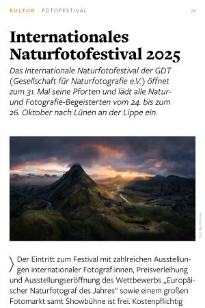 Das Internationale Naturfotofestival der GDT( Gesellschaft für Naturfotografie e. V.) öffnet zum 31. Mal seine Pforten und lädt alle Naturund Fotografie-Begeisterten vom 24. bis zum 26. Oktober nach Lünen an der Lippe ein.