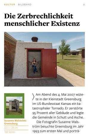 22,5 × 28 cm 160 Seiten Hardcover Sprache: Englisch 40 Euro www. kerberverlag. com die Gemeinde in Schutt und Asche. Die Fotografin Susanne Walström besuchte Greensburg im Jahr 1993 zum ersten Mal und porträtierte eine verschlafene Stadt, in der das Leben in einem langsameren Tempo verläuft. Mehr als drei Jahrzehnte und 18 Jahre nach dem verheerenden Tornado ist sie nun zurückgekehrt, um den Wandel der Stadt zu dokumentieren. Wie konnte eine Stadt, die fast völlig von der Landkarte verschwunden war, mit dem neuen Schwerpunkt Nachhaltigkeit wieder aufgebaut werden? Was ist aus den Menschen geworden, die sie einst fotografiert hat? Und wie ist es, in der „ Tornado Alley“ zu leben, einem Ort, der immer wieder von heftigen Stürmen heimgesucht wird?