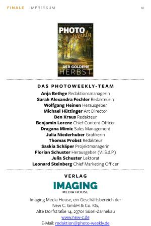 Imaging Media House, ein Geschäftsbereich der New C. GmbH & Co. KG, Alte Dorfstraße 14, 23701 Süsel-Zarnekau www. new-c. de E-Mail: redaktion @ photo-weekly. de Geschäftsführer: Wolfgang Heinen und Florian Schuster