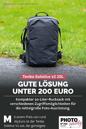 165 Euro ist der Tenba Solstice V2 20L der günstigste Rucksack in unserem Testfeld. Sein Foto-Hauptfach hat ein Volumen von 20 Litern und bietet Stauraum für ein bis zwei professionelle Systemkameras und fünf bis acht kleine bis mittelgroße Objektive. Da es sich um einen klassischen Fotorucksack handelt, ist der gesamte Innenraum auf Equipment ausgelegt. Das bedeutet, dass sich wahlweise auch Kamera-Objektiv-Kombinationen mit einer Gesamtlänge von bis zu 42 Zentimetern unterbringen lassen. Dadurch eignet sich der Rucksack auch für Fotografen, die gerne lichtstarke Profi-Zooms oder Zooms