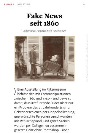 Eine Ausstellung im Rijksmuseum befasst sich mit Fotomanipulationen zwischen 1860 und 1940 – und beweist damit, dass irreführende Bilder nicht nur ein Problem des 21. Jahrhunderts sind: Geister erschienen per Doppelbelichtung, unerwünschte Personen verschwanden mit Retuschepinsel, und ganze Szenen wurden per Collage neu zusammengesetzt. Ganz ohne Photoshop – aber mit viel Fantasie und dunkler Kammer.
