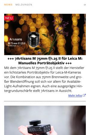 +++ 7Artisans M 75mm f / 1.25 II für Leica M: Manuelles Porträtobjektiv +++ Mit dem 7Artisans M 75mm f / 1.25 II stellt der Hersteller ein lichtstarkes Porträtobjektiv für Leica-M-Kameras vor. Die Kombination aus 75mm Brennweite und großer Blendenöffnung soll sich vor allem für Available- Light-Aufnahmen eignen. Auch eine ausgeprägte Hintergrundunschärfe stellt 7Artisans in Aussicht.