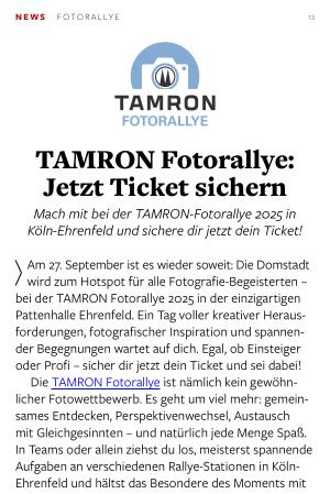 Am 27. September ist es wieder soweit: Die Domstadt wird zum Hotspot für alle Fotografie-Begeisterten – bei der TAMRON Fotorallye 2025 in der einzigartigen Pattenhalle Ehrenfeld. Ein Tag voller kreativer Herausforderungen, fotografischer Inspiration und spannender Begegnungen wartet auf dich. Egal, ob Einsteiger oder Profi – sicher dir jetzt dein Ticket und sei dabei!