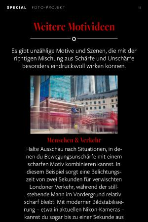 Mitzieheffekt Ziehe die Kamera mit einem sich bewegenden Motiv mit – idealerweise mit einem speziellen Mitzieh-Stativkopf und dem Motiv stets im Zentrum des Bildes. Wichtig ist eine langsame Verschlusszeit, denn nur so entsteht die gewünschte Bewegungsunschärfe im Hintergrund, während das Motiv selbst – mit etwas Glück – scharf bleibt. In unserem Beispiel hat 1 / 30 Sekunde gut funktioniert.