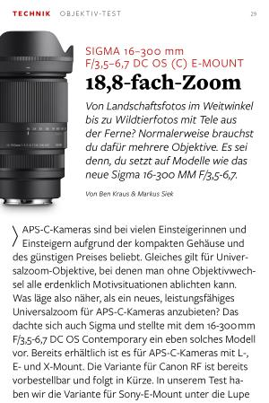Einsteigern aufgrund der kompakten Gehäuse und des günstigen Preises beliebt. Gleiches gilt für Universalzoom-Objektive, bei denen man ohne Objektivwechsel alle erdenklich Motivsituationen ablichten kann. Was läge also näher, als ein neues, leistungsfähiges Universalzoom für APS-C-Kameras anzubieten? Das dachte sich auch Sigma und stellte mit dem 16-300 mm F / 3,5-6,7 DC OS Contemporary ein eben solches Modell vor. Bereits erhältlich ist es für APS-C-Kameras mit L-, E- und X-Mount. Die Variante für Canon RF ist bereits vorbestellbar und folgt in Kürze. In unserem Test haben wir die Variante für Sony-E-Mount unter die Lupe genommen. Selbst für Superzoom-Verhältnisse ist der Zoomfaktor des neuen Sigma mit einem Wert von 18,8- fach enorm hoch.