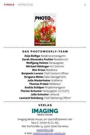 Imaging Media House, ein Geschäftsbereich der New C. GmbH & Co. KG, Alte Dorfstraße 14, 23701 Süsel-Zarnekau www. new-c. de E-Mail: redaktion @ photo-weekly. de Geschäftsführer: Wolfgang Heinen und Florian Schuster