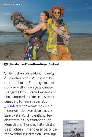 „ Ein Leben ohne Hund ist möglich, aber sinnlos“ – diesem berühmten Loriot-Zitat folgend, hat sich der vielfach ausgezeichnete Fotograf Hans-Jürgen Burkard auf eine sommerliche Reise ans Meer begeben. Für sein neues Buch „ Hundestrand“ wanderte er kilometerweit den Hundestrand von Sankt Peter-Ording entlang, beobachtete das Miteinander von Mensch und Tier und ließ sich die Geschichten hinter dieser besonderen Verbindung erzählen. Herausgekommen ist ein ebenso liebevoll wie