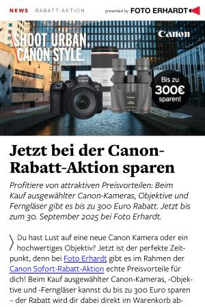 Du hast Lust auf eine neue Canon Kamera oder ein hochwertiges Objektiv? Jetzt ist der perfekte Zeitpunkt, denn bei Foto Erhardt gibt es im Rahmen der Canon Sofort-Rabatt-Aktion echte Preisvorteile für dich! Beim Kauf ausgewählter Canon-Kameras,-Objektive und-Ferngläser kannst du bis zu 300 Euro sparen – der Rabatt wird dir dabei direkt im Warenkorb abgezogen! Die Aktion läuft noch bis zum 30. September 2025, also nutze deine Chance und schlag schnell zu!