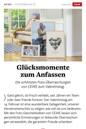 Ganz gleich, ob frisch verliebt, seit Jahren ein Team oder best friends forever: Der Valentinstag am 14. Februar ist eine wunderbare Gelegenheit, unseren Herzensmenschen zu zeigen, wie viel sie uns bedeuten. Mit den Foto-Geschenkideen von CEWE lassen sich persönliche Erinnerungen in liebevolle Überraschungen verwandeln, die garantiert Freude schenken.