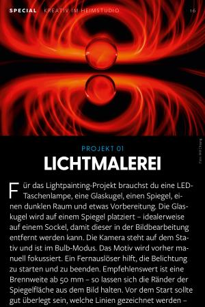 Taschenlampe, eine Glaskugel, einen Spiegel, einen dunklen Raum und etwas Vorbereitung. Die Glaskugel wird auf einem Spiegel platziert – idealerweise auf einem Sockel, damit dieser in der Bildbearbeitung entfernt werden kann. Die Kamera steht auf dem Stativ und ist im Bulb-Modus. Das Motiv wird vorher manuell fokussiert. Ein Fernauslöser hilft, die Belichtung zu starten und zu beenden. Empfehlenswert ist eine Brennweite ab 50 mm – so lassen sich die Ränder der Spiegelfläche aus dem Bild halten. Vor dem Start sollte gut überlegt sein, welche Linien gezeichnet werden – denn sie erscheinen durch den Spiegel doppelt im Bild. Dann wird das Licht ausgeschaltet, der Verschluss geöffnet und die Taschenlampe direkt auf die zusammengelegten Finger gedrückt, um Streulicht zu vermeiden. Jetzt werden die gewünschten Formen in die Luft „ gemalt“. Ist die Bewegung beendet, wird die Lampe abgeschaltet und der Verschluss wieder geschlossen.