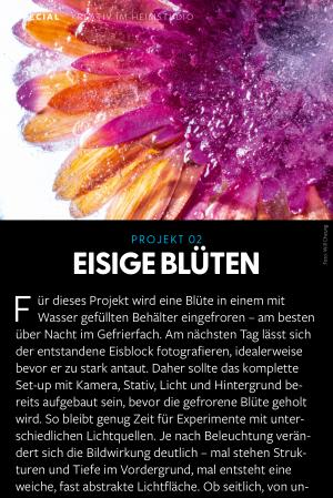 Wasser gefüllten Behälter eingefroren – am besten über Nacht im Gefrierfach. Am nächsten Tag lässt sich der entstandene Eisblock fotografieren, idealerweise bevor er zu stark antaut. Daher sollte das komplette Set-up mit Kamera, Stativ, Licht und Hintergrund bereits aufgebaut sein, bevor die gefrorene Blüte geholt wird. So bleibt genug Zeit für Experimente mit unterschiedlichen Lichtquellen. Je nach Beleuchtung verändert sich die Bildwirkung deutlich – mal stehen Strukturen und Tiefe im Vordergrund, mal entsteht eine weiche, fast abstrakte Lichtfläche. Ob seitlich, von unten oder mit mehreren Lichtquellen kombiniert: Dieses Projekt lädt zum Ausprobieren ein. Zudem kann es mit unterschiedlichen Blüten wiederholt werden.