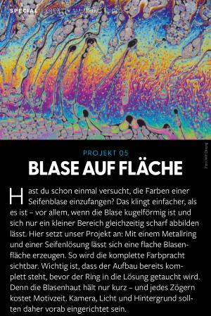 es ist – vor allem, wenn die Blase kugelförmig ist und sich nur ein kleiner Bereich gleichzeitig scharf abbilden lässt. Hier setzt unser Projekt an: Mit einem Metallring und einer Seifenlösung lässt sich eine flache Blasenfläche erzeugen. So wird die komplette Farbpracht sichtbar. Wichtig ist, dass der Aufbau bereits komplett steht, bevor der Ring in die Lösung getaucht wird. Denn die Blasenhaut hält nur kurz – und jedes Zögern kostet Motivzeit. Kamera, Licht und Hintergrund sollten daher vorab eingerichtet sein.