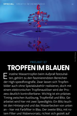 E inzelne Wassertropfen beim Aufprall festzuhalten, gehört zu den faszinierendsten Bereichen der High-speedfotografie. Zwar lassen sich Tropfenbilder auch ohne Spezialzubehör realisieren, doch mit einem elektronischen Tropfenauslöser wird der Prozess deutlich kontrollierbarer. Wichtig ist ein präzises Timing zwischen Auslösung, Tropfenfall und Blitz. Gearbeitet wird hier mit zwei Speedlights: Ein Blitz leuchtet den Hintergrund und das Wasserbecken von unten an – hier mit Farbfilter in Blau. Der zweite Blitz, mit rotem Filter und Wabenvorsatz, richtet sich gezielt auf die Stelle, an der der Tropfen auftrifft. Beide Blitze laufen mit minimaler Leistung( 1 / 128 oder 1 / 256), um extrem kurze Leuchtzeiten zu erzielen. Die Kamera wird auf einem Stativ fixiert und manuell fokussiert. Als Belichtungszeit dient die Blitzsynchronzeit – meist 1 / 200 oder 1 / 250 s –, da die eigentliche Belichtung durch den Blitz erfolgt. Mit etwas Übung lassen sich so gestochen scharfe Tropfenformationen einfangen.