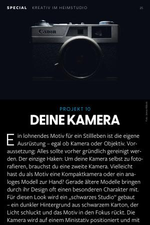 Ausrüstung – egal ob Kamera oder Objektiv. Voraussetzung: Alles sollte vorher gründlich gereinigt werden. Der einzige Haken: Um deine Kamera selbst zu fotorafieren, brauchst du eine zweite Kamera. Vielleicht hast du als Motiv eine Kompaktkamera oder ein analoges Modell zur Hand? Gerade ältere Modelle bringen durch ihr Design oft einen besonderen Charakter mit. Für diesen Look wird ein „ schwarzes Studio“ gebaut – ein dunkler Hintergrund aus schwarzem Karton, der Licht schluckt und das Motiv in den Fokus rückt. Die Kamera wird auf einem Ministativ positioniert und mit Langzeitbelichtung und Lichtmalerei in Szene gesetzt. Eine Taschenlampe mit Diffusor( z. B. ein Stück Papier) sorgt für gezielte Akzente – so wird aus funktionalem Werkzeug ein echtes Porträt.