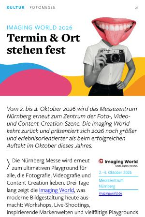 Vom 2. bis 4. Oktober 2026 wird das Messezentrum Nürnberg erneut zum Zentrum der Foto-, Videound Content-Creation-Szene. Die Imaging World kehrt zurück und präsentiert sich 2026 noch größer und erlebnisorientierter als beim erfolgreichen Auftakt im Oktober dieses Jahres.