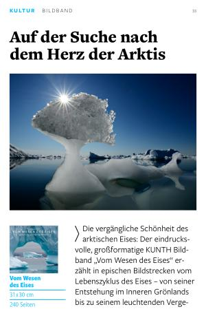 Die vergängliche Schönheit des arktischen Eises: Der eindrucksvolle, großformatige KUNTH Bildband „ Vom Wesen des Eises“ erzählt in epischen Bildstrecken vom Lebenszyklus des Eises – von seiner Entstehung im Inneren Grönlands bis zu seinem leuchtenden Vergehen bei arktischen Sonnenuntergängen auf dem Meer.