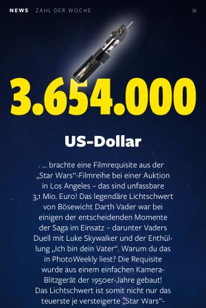 ... brachte eine Filmrequisite aus der „ Star Wars“-Filmreihe bei einer Auktion in Los Angeles – das sind unfassbare 3,1 Mio. Euro! Das legendäre Lichtschwert von Bösewicht Darth Vader war bei einigen der entscheidenden Momente der Saga im Einsatz – darunter Vaders Duell mit Luke Skywalker und der Enthüllung „ Ich bin dein Vater“. Warum du das in PhotoWeekly liest? Die Requisite wurde aus einem einfachen Kamera- Blitzgerät der 1950er-Jahre gebaut! Das Lichtschwert ist somit nicht nur das teuerste je versteigerte „ Star Wars“- Objekt, sondern höchstwahrscheinlich auch der teuerste Kamerazubehör.