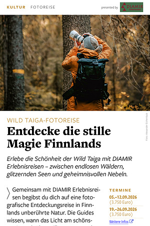 Gemeinsam mit DIAMIR Erlebnisreisen begibst du dich auf eine fotografische Entdeckungsreise in Finnlands unberührte Natur. Die Guides wissen, wann das Licht am schönsten ist – ob über stillen Mooren oder zwischen alten Kiefern. Genieße die Ruhe der Wildnis, den Duft von Terva in der Rauchsauna und die Magie des Nordens im besten Licht. Unterstützt wirst du von Radiant Photo, der Software für einfache und professionelle Bildbearbeitung direkt unterwegs.