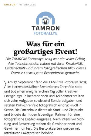 Am 27. September fand die TAMRON Fotorallye 2025 im Herzen des Kölner Szeneviertels Ehrenfeld statt und bot einen ereignisreichen Tag voller kreativer Energie. 130 Teilnehmerinnen und Teilnehmer stellten sich zehn Aufgaben sowie zwei Sonderaufgaben und setzten Köln-Ehrenfeld fotografisch eindrucksvoll in Szene. Die Pattenhalle diente als Start- und Zielpunkt und bildete damit den lebendigen Rahmen für eine fotografische Entdeckungsreise. Nach intensiver Sichtung und Bewertung stehen die Gewinnerinnen und Gewinner nun fest. Die Bestplatzierten wurden mit attraktiven Paketpreisen belohnt.