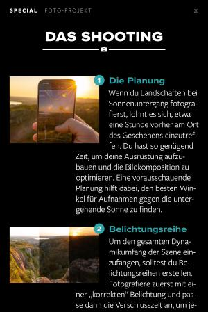 Um den gesamten Dynamikumfang der Szene einzufangen, solltest du Belichtungsreihen erstellen. Fotografiere zuerst mit einer „ korrekten“ Belichtung und passe dann die Verschlusszeit an, um jeweils eine über- und unterbelichtete Aufnahme zu erstellen – idealerweise um eine bis zwei Blendenstufen.