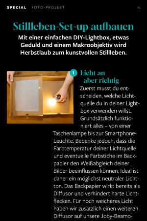 Stillleben-Set-up aufbauen Mit einer einfachen DIY-Lightbox, etwas Geduld und einem Makroobjektiv wird Herbstlaub zum kunstvollen Stillleben.