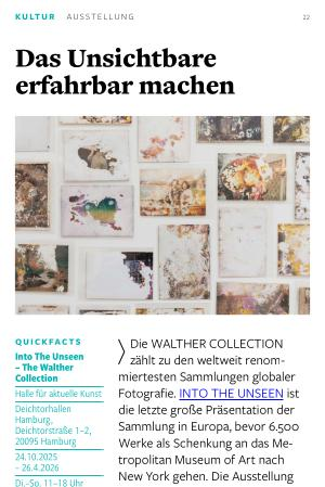 Die WALTHER COLLECTION zählt zu den weltweit renommiertesten Sammlungen globaler Fotografie. INTO THE UNSEEN ist die letzte große Präsentation der Sammlung in Europa, bevor 6.500 Werke als Schenkung an das Metropolitan Museum of Art nach New York gehen. Die Ausstellung zeigt zeitgenössische künstlerische Arbeiten, historische Werke und Fotoalben aus der Sammlung, die