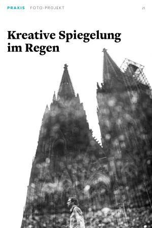 Eine Möglichkeit, spannende Fotos zu schießen, bietet dir ein einfacher Perspektivenwechsel. In die Hocke gekniet oder auf die Zehenspitzen gestellt ist eine andere Sicht auf das Fotomotiv möglich. Das haben wir auch an einem regnerischen Tag ausprobiert und dem Kölner Dom einen Besuch abgestattet. Um die kolossale Kathedrale etwas anders im Bild festzuhalten, haben wir ihre Spiegelung in einer Pfütze auf der Straße aus einer tiefen Perspektive abgelichtet. Die Wasseroberfläche verleiht der Aufnahme eine gröbere Struktur und sorgt für eine verträumte Stimmung im Bild. Passanten mit Regenschirmen oder vorbeirasende Fahrräder bereichern noch zusätzlich die gespiegelte Bildkomposition.