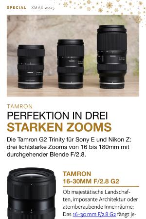 KREATIVE VIELFALT Dank seiner kompakten Bauform bleibt das 70 – 180 mm G2 selbst bei langen Fototagen angenehm leicht. Zusammen mit dem 16 – 30 mm und 28 – 75 mm bildet es eine Trinity, die kreative Freiheit neu definiert: drei Objektive, ein durchgängiges Konzept, maximale Qualität. Wer einmal mit dieser Kombination gearbeitet hat, wird verstehen, warum die Tamron G2 Trinity mehr ist als nur ein Set aus drei Zooms – sie ist der Schlüssel zu außergewöhnlichen Bildern, egal ob auf Reisen, im Studio oder beim winterlichen Shooting.