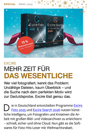 Foto 2025 und Excire Search 2026 nutzen künstliche Intelligenz, um Fotografen und Kreativen die Arbeit mit großen Bild- und Videoarchiven zu erleichtern – schnell, sicher und ohne Cloud. Nun gibt es die Softwares für Foto Hits-Leser mit Weihnachtsrabatt.