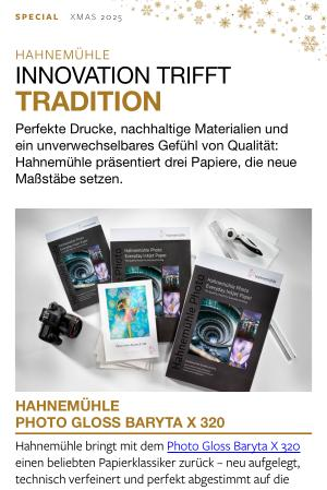 Hahnemühle bringt mit dem Photo Gloss Baryta X 320 einen beliebten Papierklassiker zurück – neu aufgelegt, technisch verfeinert und perfekt abgestimmt auf die Anforderungen moderner Inkjet-Drucksysteme. Das hellweiße Papier aus 100 % Alpha-Zellulose überzeugt durch seine hochglänzende Oberfläche und eine hochwertige Baryt-Beschichtung, die den typischen Look klassischer Silberhalogenid-Fotopapiere authentisch nachbildet. Die neue Beschichtung sorgt für eine gleichmäßige, feinporige Farbverteilung und konstante Ergebnisse – von brillanten Hochglanzfotos über kontrastreiche Schwarzweißdrucke bis hin zu ausdrucksstarken Ausstellungsprints. Mit 320 g / m ² bietet das Papier eine exzellente Haptik, hohe Steifigkeit und Stabilität – ideal für die Präsentation von Bildern, die Eindruck hinterlassen sollen.