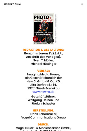 Imaging Media House, ein Geschäftsbereich der New C. GmbH & Co. KG, Alte Dorfstraße 14, 23701 Süsel-Zarnekau www. new-c. de E-Mail: redaktion @ photo-weekly. de Geschäftsführer: Wolfgang Heinen und Florian Schuster